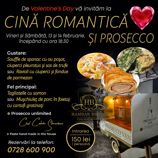 De Valentine’s Day, Hambar Bistro te invită să transformi o simplă cină într-o experiență romantică memorabilă. În vineri și sâmbătă, 13 și 14 februarie, începând cu ora 18:30, restaurantul pregătește o Cină Romantică cu Prosecco Unlimited, dedicată celor care vor